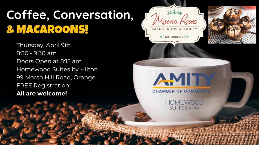 Join the Amity Chamber on Thursday, April 9th, for “Coffee, Conversation, and MACAROONS!”