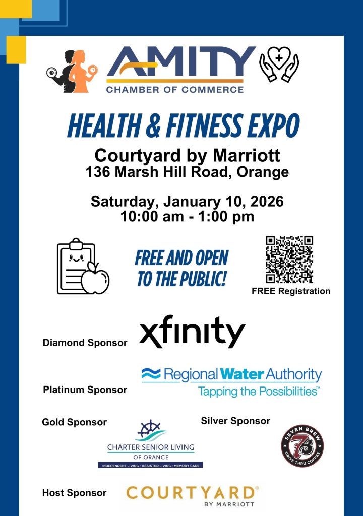 ORANGE, Connecticut, December 8, 2025 – The Amity Chamber of Commerce Health and Fitness Expo will ring in the New Year on Saturday, January 10th, at the Courtyard by Marriott, 136 Marsh Hill Road, from 10:00 a.m. to 1:00 p.m. The Expo is free and open to the public.