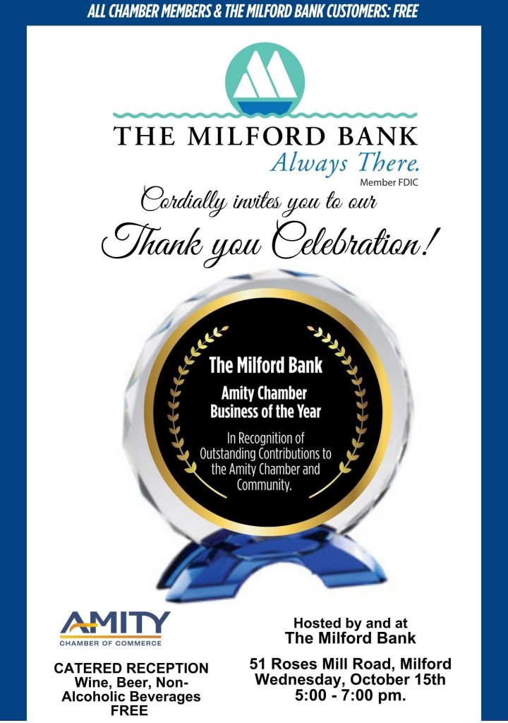 The Milford Bank (TMB), honored recently as the “2025 Amity Chamber of Commerce Business of the Year,” in recognition of the bank’s outstanding contributions to the Chamber and the community, is hosting a “Thank You Celebration!” on October 15th at the bank’s 51 Roses Mill Road, Milford location from 5:00 pm- 7:00 pm.